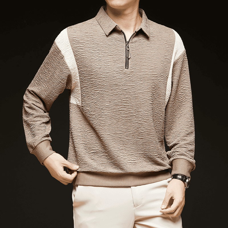 Men’s Brown Zipper Polo T-Shirt – Textured Contrast Panel Design - Goamen